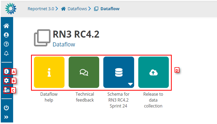 - Dataflow help for accessing to the dataflow help page, in here you will find three tabs showing documents, links and technical overview of the reporting schema (explained in section Dataflow help).