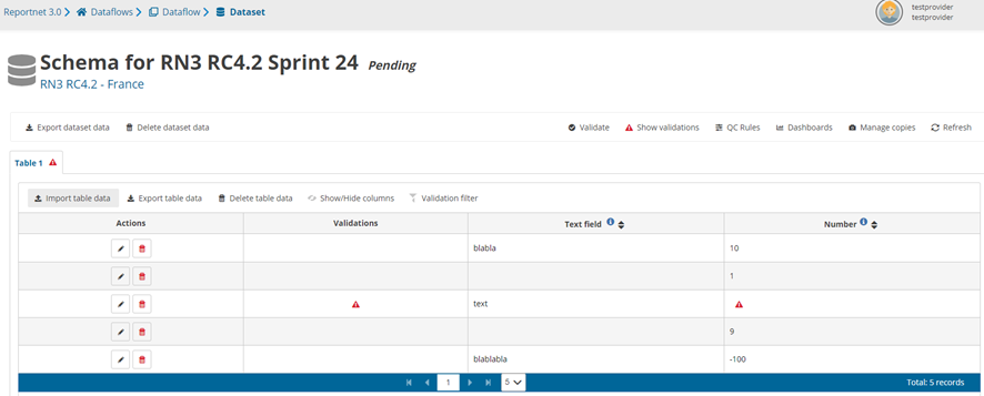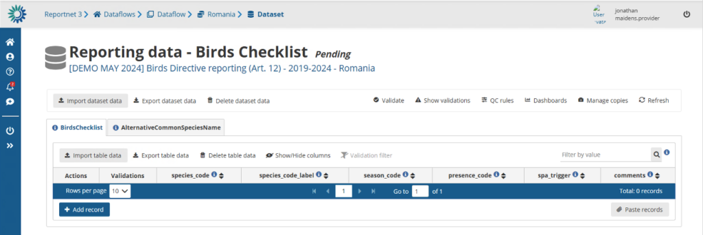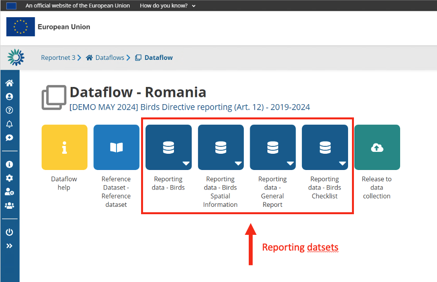 A reporter can submit data into Reportnet before submitting the final result to the requester. A reporter can perform several iterations such as import data, perform validations, correct data and import again. Sometimes data is pre-loaded for you. In that case you can snapshot this data or export a copy to your desktop, edit it over the interface or replace it with data from your own database. When you are at the dataflow main page you might see one or more “datasets”.