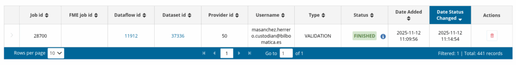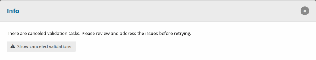 During the validation of a dataset, some QC rules might not be validated even though the job has finished successfully. These rules can be found in the job monitoring window for the validation job and are described as Canceled Validation Tasks. Jobs with further information have an info icon next to the status. This button is clickable.