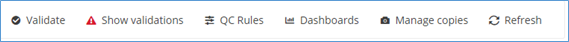 - Show validations – Shows a table of all the validation issues found across the whole dataset after a validation has been run.