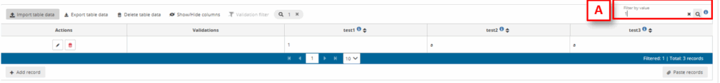 To filter table data, insert in an input text in the table bar ‘Filter value’ [A] the text you want