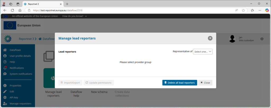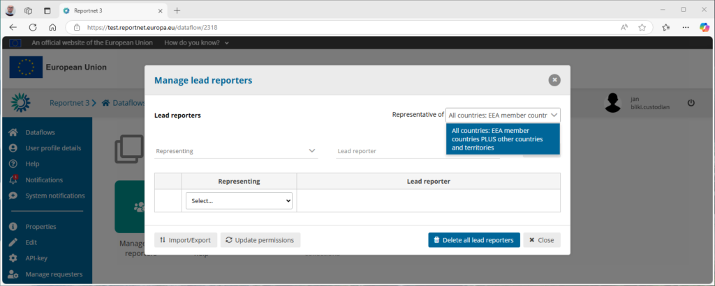 The first action is to select the “Representative of”-list. The popup on the top right allows you to select one. For the standard Reporting dataflows there is currently only one called “All countries; EEA Member countries PLUS other countries and territories”.