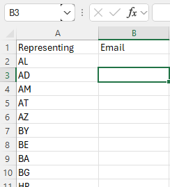 Export template : Will generate you a template you can edit in a notepad or excel. Be aware that the format is .csv and not excel. Reportnet will use the ISO2 code for each country and a place where you can write the email address.