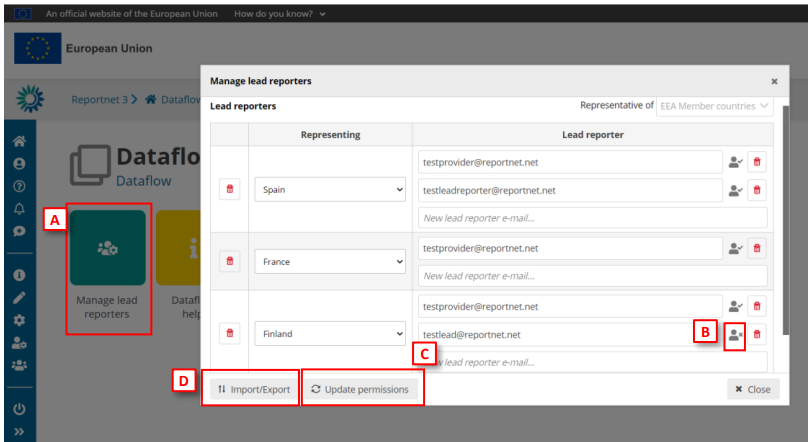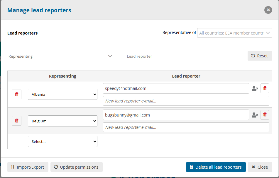 You will notice that a table is generated where you can select a Representing and Lead reporter. Each time you select a country a text field appears where you can write the reporters email-address. More then one lead reporter can be provided. Reportnet allows you export and import that list as well as this is a lot off manual labor you don’t want to repeat every year.