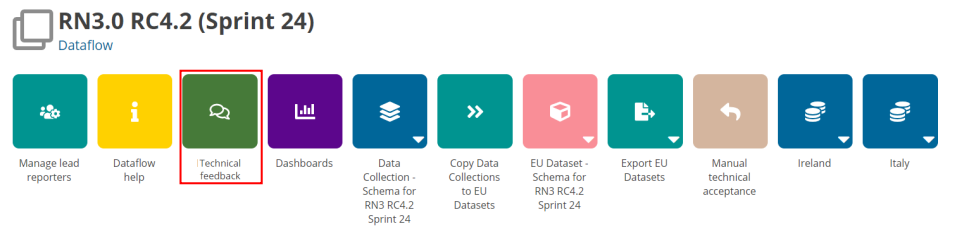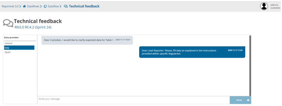 at Dataflow level (‘Technical Feedback‘ button). - User can select a country and see the messages (not read), get previous