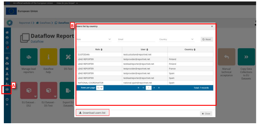 - A pop-up [B] will appear where you can see the list of users for this dataflow